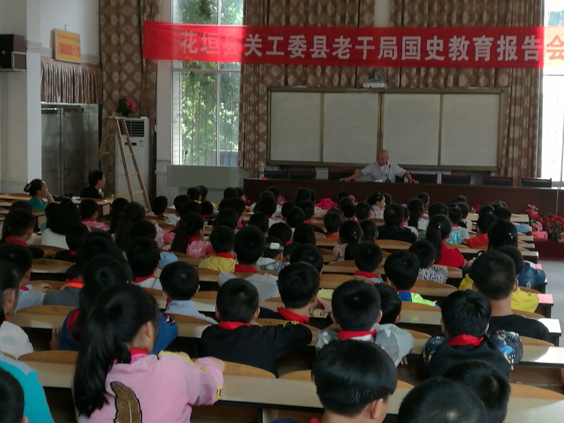 9月29日下午,花垣县边城镇小学的数百名师生,整齐的坐在校阶梯教室,听取县关工委县老干局组织的国史教育报告会,开展国国党史国史教育,是青少年学生最好的¨营养品和兴奋剂¨,是培养青少年爱国爱家的有效方式,为此花垣县关工委县老干局组织德高望重的老英雄、老干部、老教师等组成宣讲组丶巡回到各学校,开展国史宣讲,帮助青少年学生树立正确人生观、价值观,激励学生好好学习,争做国家有用之才,老教师欧昌海的精彩报告,不时获得师生们的阵掌声。