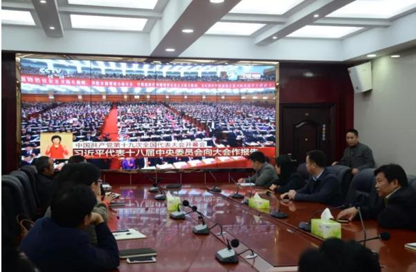 在湖南东方矿业集团会议室,干部职工齐聚一起准时收看十九大电视直播。