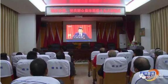 在民乐镇响水村,村民以及党员干部聚集在会议室共同观看。