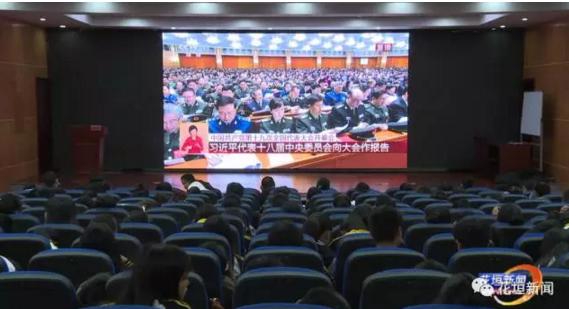 在县职业技术学校报告厅内,全体师生们聚精会神,仔细聆听十九大报告的一句一字。