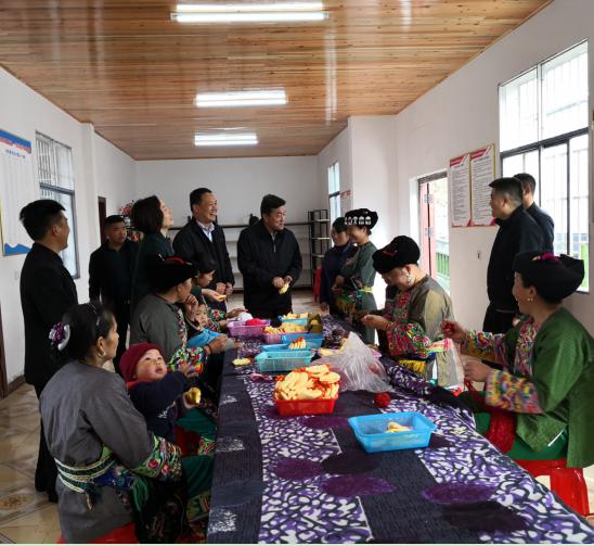 在岩锣村巾帼扶贫车间,李民与车间的妇女们亲切交流,了解她们在车间的就业、收入情况。李民表示,就业扶贫车间的建立,为岩锣村许多需要照顾家庭没有经济来源的妇女提供了家门口就业的机会,有效拓宽了苗家妇女特别是贫困妇女的增收渠道,“支部搭台+企业订单”的扶贫模式值得学习推广。