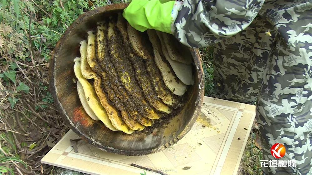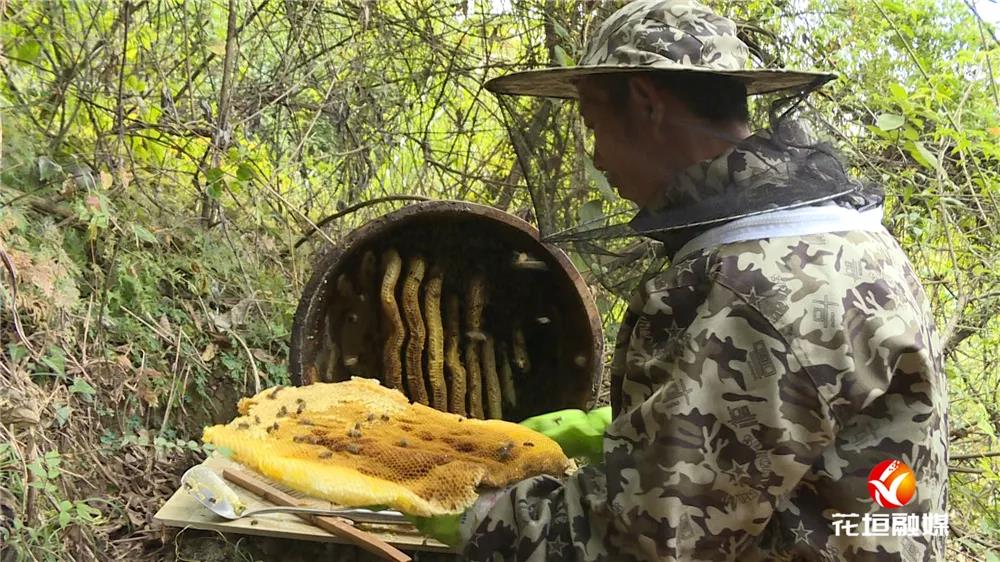 在排楼村蜿蜒崎岖的山道和悬崖边,一桶桶蜜蜂有序地摆放在山林和悬崖边。打开蜂箱,密密麻麻的蜜蜂四处飞舞,来回盘旋在蜂箱周围。