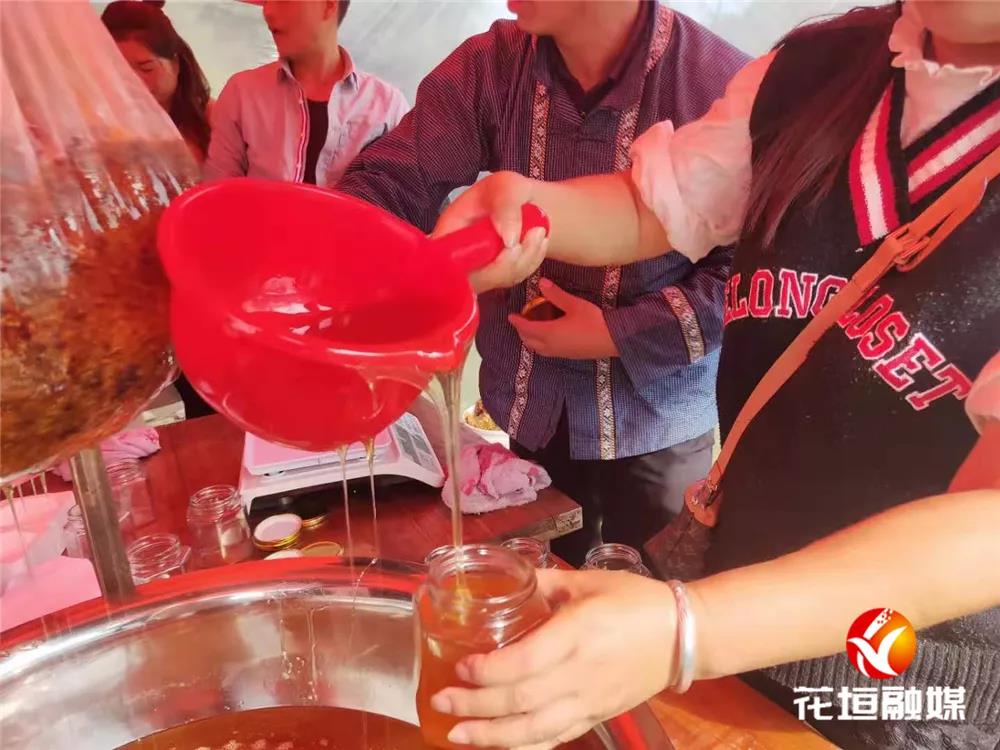 排楼村蜂场负责人石吉斌正在取蜂蜜,许多顾客慕名而来,观看如何取蜂蜜,看着沉甸甸的蜂脾,许多顾客已经按耐不住纷纷品尝起来,已经是老顾客的龙晓琴说:“他这个蜂蜜正宗,已经订过几次了,听说要取蜂蜜,我们就一起来了,今天我都订了50斤。”