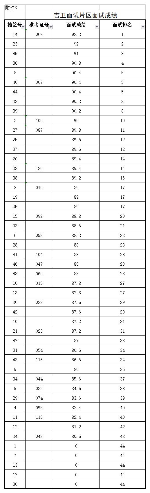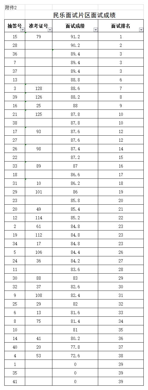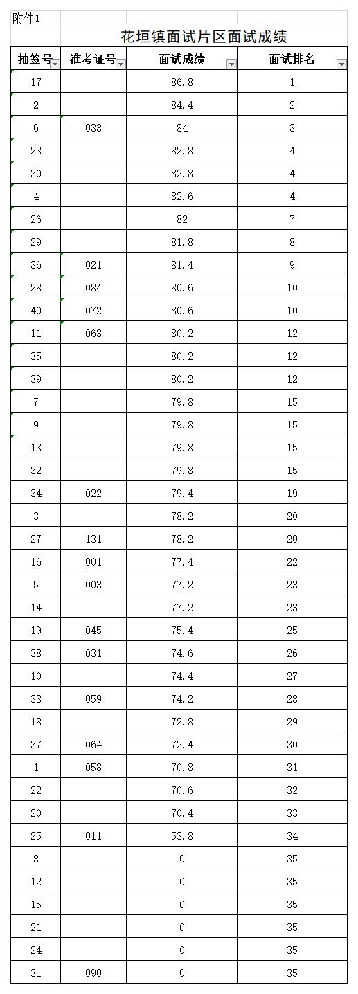 文章来源:县委组织部 作者:县委组织部 时间:2020-11-04 19:09:36根据《花垣县2020年公开选聘大学生村主干简章》,11月4日,全县分三个面试片区组织面试,面试成绩公示如下。体检将于近期进行,有关事宜以电话通知为准,请考生保持电话畅通。