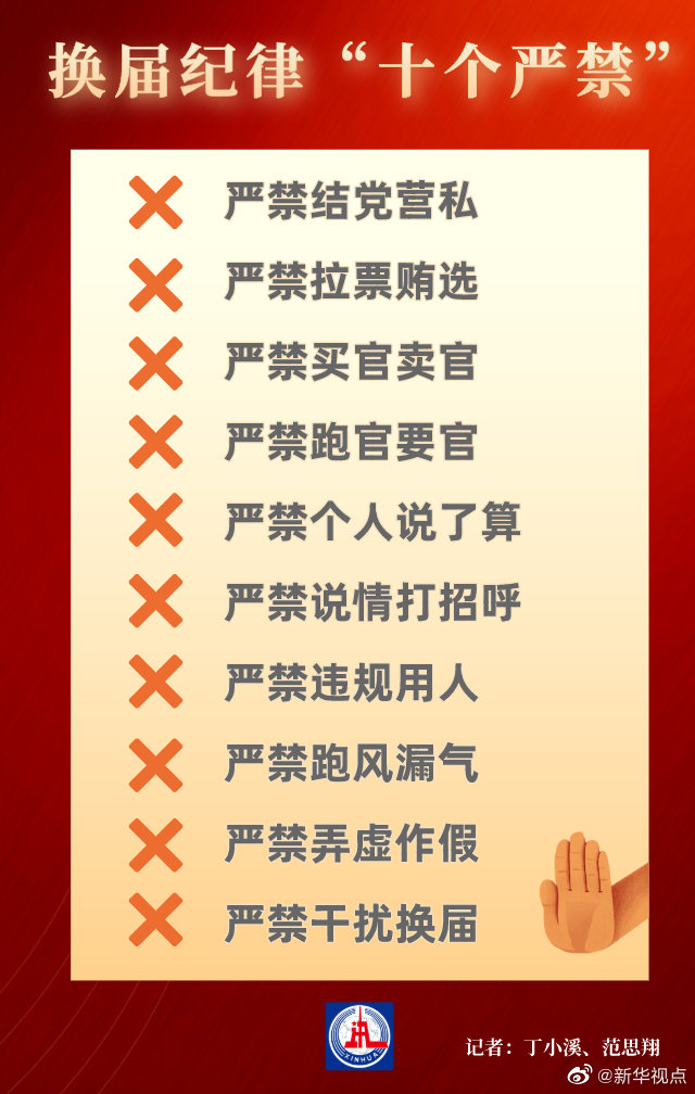 《通知》规定,要严明换届纪律,坚决维护换届工作严肃性。一是严禁结党营私,对拉帮结派、上下勾联、搞团团伙伙和小圈子的,以人划线、任人唯亲、排斥异己的,培植个人势力、结成利益集团的,一律给予党纪政务处分。二是严禁拉票贿选,对通过宴请、安排消费活动,快递邮寄、电子红包、网上转账等方式赠送礼品礼金,以及打电话、发信息、当面拜访、委托他人出面等形式,在民主推荐和选举中搞拉票、串联、助选等非组织活动的,一律排除出人选名单或者取消候选人资格,并视情节轻重给予党纪政务处分,贿选的依法处理。三是严禁买官卖官,对以谋取职务、提高职级待遇等为目的贿赂他人的,通过帮助他人谋取职务、提高职级待遇索取、收受贿赂的,一律先停职或者免职,并依规依纪依法处理。四是严禁跑官要官,对采取拉关系或者要挟等手段谋取职务、提高职级待遇的,一律不得提拔或者进一步使用,并视情节轻重给予批评教育、组织处理或者党纪政务处分。五是严禁个人说了算,对以个人决定代替党组织集体研究决定的,授意、暗示、指定提拔调整人选的,一律取消相关任用决定,并严肃追究相关领导和有关人员责任。六是严禁说情打招呼,对为他人推荐提名、提拔调整疏通关系的,违规干预下级或者原任职地区和单位干部选拔任用的,一律作为领导干部违规插手干预重大事项的情形记录在案,并视情节轻重给予批评教育、组织处理或者党纪政务处分。七是严禁违规用人,对借换届之机突击提拔调整干部、超职数配备干部、违反规定程序选拔任用干部的,一律宣布无效,并对相关人员依规依纪进行处理。八是严禁跑风漏气,对泄露、扩散换届人事安排等保密信息的,一律追究相关人员责任。九是严禁弄虚作假,对篡改、伪造干部人事档案材料的,在换届考察工作中隐瞒或者歪曲事实真相的,一律予以纠正,并视情节轻重对相关人员给予组织处理或者党纪政务处分。十是严禁干扰换届,对境内外敌对势力搅扰破坏换届的,严加防范、坚决打击;对黑恶势力、家族势力、宗教势力干扰影响换届选举的,违规接受境外机构、组织、个人提供资助或者培训的,以威胁、欺骗、利诱等手段妨害他人自由行使选举权的,造谣诽谤、诬告陷害或者打击报复他人的,一律严厉查处,涉嫌违法犯罪的依法追究法律责任。