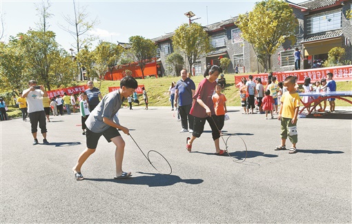 9月20日,花垣县民乐镇易地扶贫搬迁安置区,孩子们在玩游戏。当天,花垣县举办中秋节“关爱留守儿童 促进社区融入”趣味活动,孩子们积极参与滚铁环、托乒乓球跑、跳绳、投篮球等趣味活动,开开心心迎接中秋佳节。龙恩泽 摄