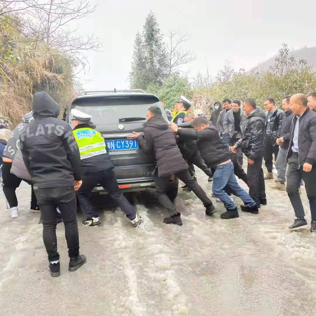 2月17日晚,花垣县公安局各部门、警种以雪为令,迅速出动,立即启动应急预案,多措并举抗击冰雪,坚决确保辖区平安。 18日上午10时许,花垣县公安局长乐派出所安排民警对辖区各道路进行巡查,当巡查至辖区龙桥村路段时,发现一辆黑色面包车轮陷入积雪内打滑,无法行驶并造成道路拥堵。发现该情况后,巡逻民警立即下车发动周围群众帮助车主推车,警民齐心一齐助车辆脱困,恢复路面正常交通。“感谢人民警察为我们排忧解难。”事后,车主对民警的帮助表示感谢。 18日上午11时45分,花垣县公安局十八洞派出所民警在十八洞景区内巡逻时发现,有三名游客模样的年轻男女正沿着结冰的马路行走着,见状,巡逻民警主动停车询问情况。其中一名男子告诉民警:他们三人来自益阳,是在校大学生,17日白天来到十八洞景区准备为毕业论文寻找素材,本想住一晚第二天早上便离开。谁知17日晚突然降雪,道路结冰,景区内的车辆无法通行。三人决定徒步走出景区再想办法回程。了解情况后,十八洞派出所民警便打开车门,让三人上车,将其安全送至客运站。 在石栏镇,辖区乡道部分路面积雪结冰,为保障人民群众平安出行,石栏派出所立即启动应急预案,迅速组织坚守在一线的民辅警与镇政府工作人员一起对积雪点展开铲雪除冰行动。民辅警们顶着寒风,用被冻得通红的双手不停地挥舞着铁锹、雪铲和扫帚……风雪中,“警察蓝”与背后的雪景交相辉映,成为了寒冬里一道靓丽的风景。