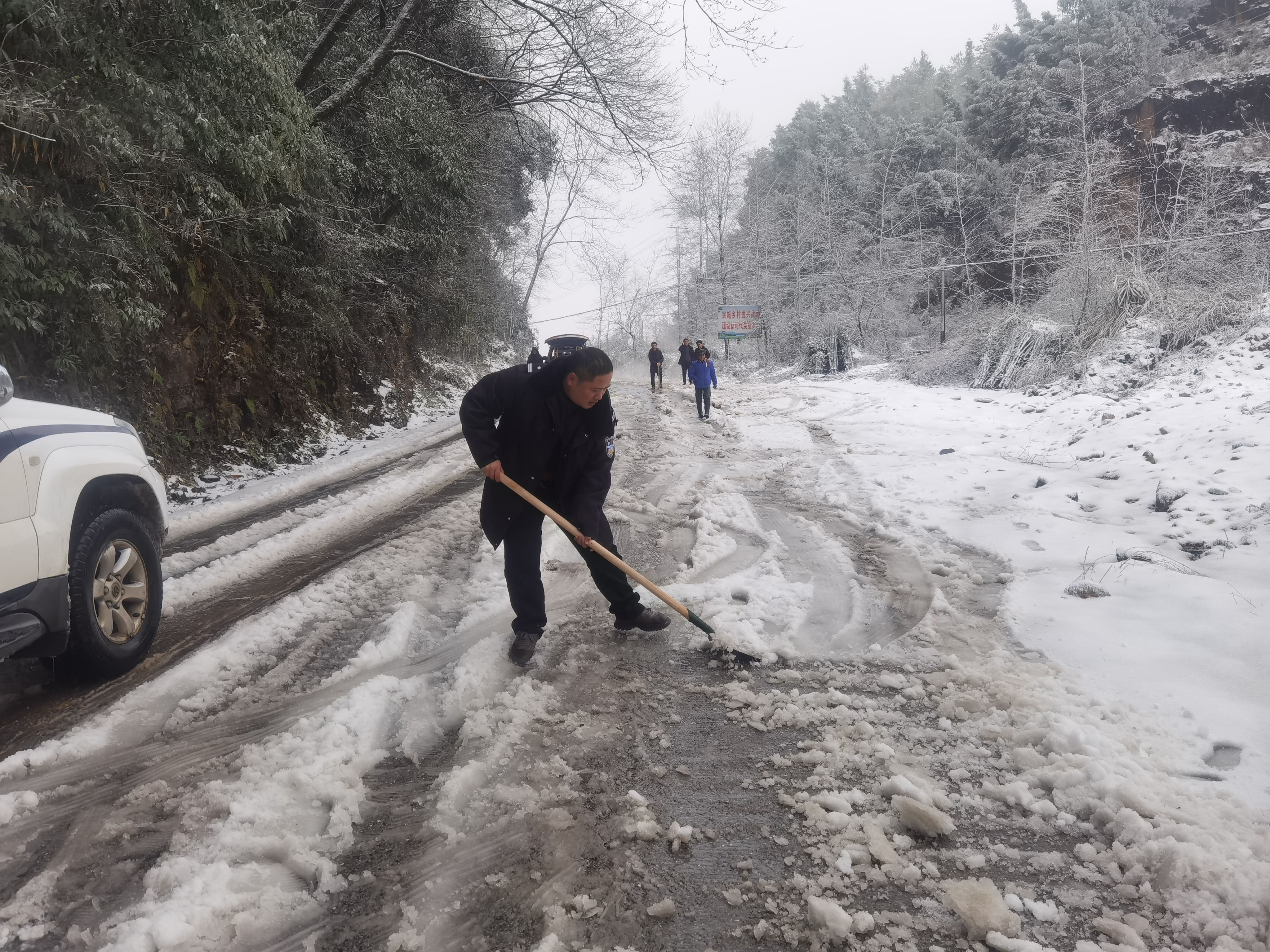18日,受降雪影响,花垣县境内国道G209线、G319线、县乡道路多个路段出现积雪,部分县乡道路面结冰湿滑,通行条件差,存在重大交通安全隐患,花垣公安全体民辅警立即进入实战状态,交警、各派出所民辅警全警上路,及时开展抗冰除雪保畅工作,利用撒盐融雪、人工铲冰除雪等方式进行路面除雪防滑工作,为辖区群众出行安全保驾护航。