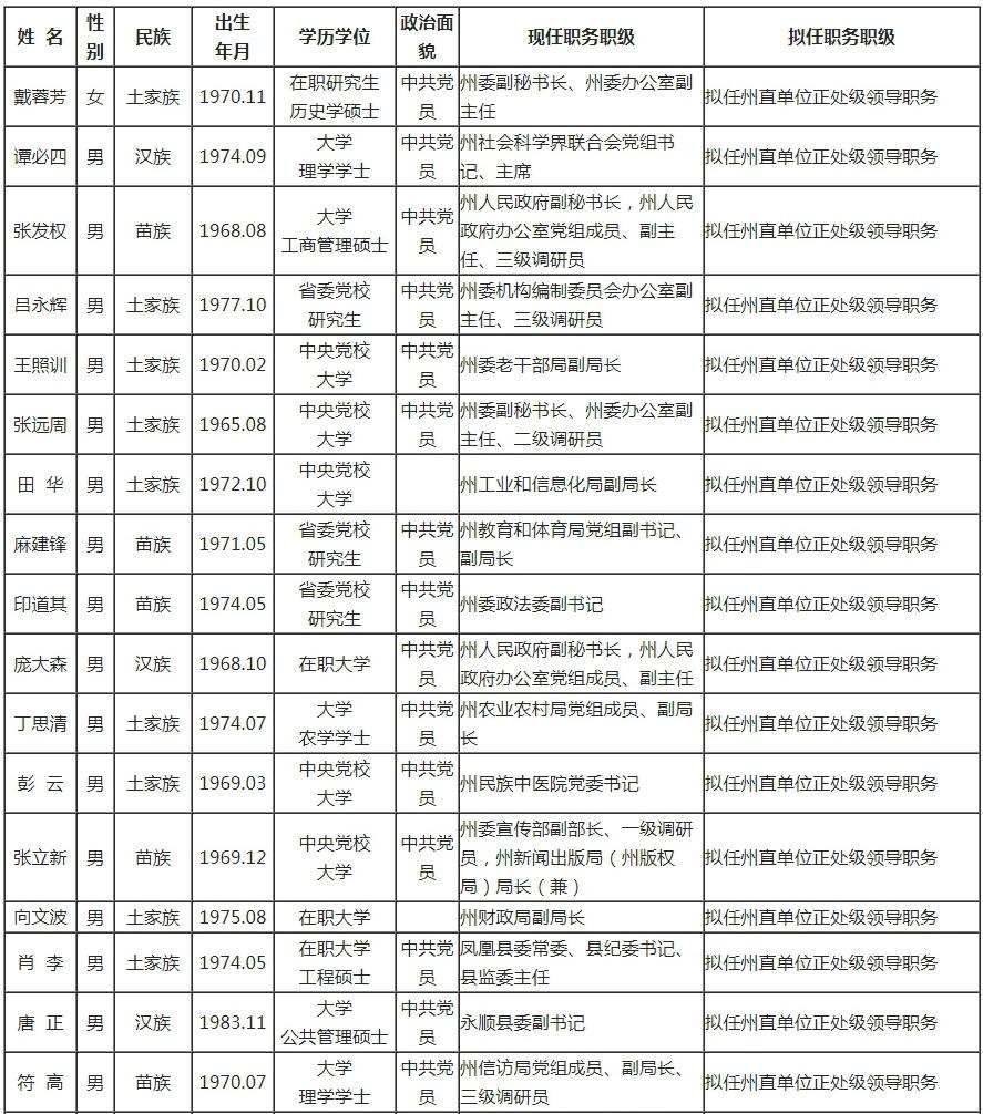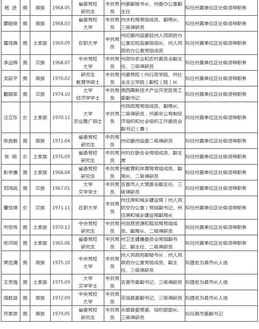 文章来源:湘西自治州委组织部 作者: 时间:2022-02-21 00:18:43为加强对干部选拔任用工作的监督,提高识别和任用干部的准确度,现对州委常委会会议研究决定的下列35名拟任职人选予以任前公示: