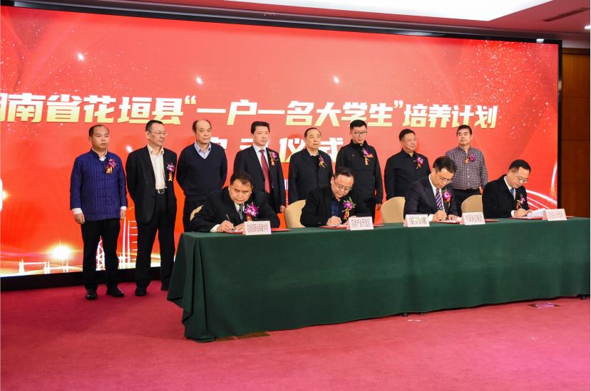 廖良辉代表湘西州委、州政府和花垣县委、县政府,向长期以来关心与支持湘西州、花垣县经济社会发展的社会各界表达了感谢。他说,花垣县是精准扶贫首倡之地,是湖南省乡村振兴示范创建县,全县上下牢记习近平总书记的重要指示和殷切嘱托,切实扛起首倡之地政治责任,努力在乡村人才培养等方面积极探索,推出“一户一名大学生”培养计划,力争通过15年的时间为花垣县培养5万名以上的大学生。他要求,要确保“一户一名大学生”培养计划取得实效。一要加强领导。县里成立专项工作领导小组,组建工作专班集中办公,统筹谋划、定期调度。二要精心推进。与合作的企业、职业院校建立联席会议制度,定期召开工作联席会议,互通信息,无缝对接。督促指导各乡镇进一步澄清目标底数,把不同年龄阶段、不同需求类型的人员统计准确,精准对接职业院校和有关企业;加强培养计划实施的政策宣传,在全社会营造“上大学、学文化、强技能”的浓厚氛围。三要强化保障。根据“边城人才行动计划”有关方案,多渠道筹集纳入培养计划对象的奖补资金,发挥好“订单式”培养等模式的优势,真正实现培养一人、就业一人,就业一人、富裕一家,为乡村振兴、共同富裕奠定坚实的人才基础。