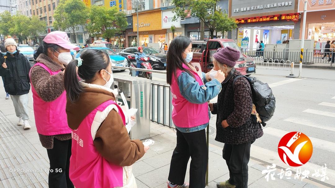 3月19日以来,花垣县妇联充分发挥职能优势,号召广大妇女党员群众积极投身到疫情防控工作中来,来自县直妇委会和社会的80余名巾帼志愿者放弃周末休息时间,在人群聚集地和人流量大的重点区域轮班开展劝导活动,为路上没有戴口罩的群众分发口罩,并提醒广大群众要做好个人防护,规范佩戴口罩,尽量减少外出,不要聚集,积极配合公共场所测温、查码的防疫措施。