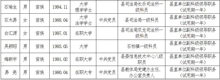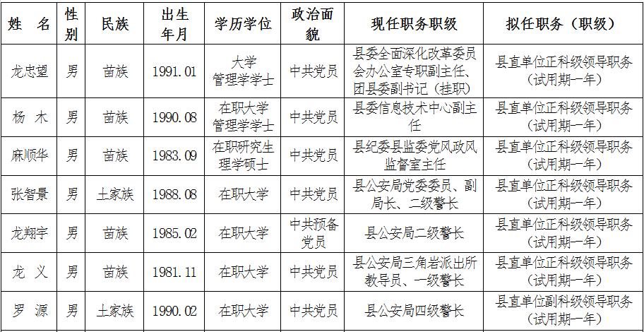 文章来源:中共花垣县委组织部 作者: 时间:2023-01-02 19:12:23为加强对干部选拔任用工作的监督,提高识别和任用干部的准确度,现对县委常委会议研究决定的13名拟任职人选予以任前公示: