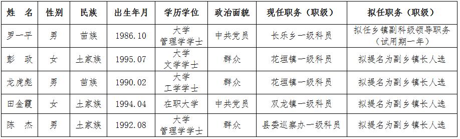 文章来源:中共花垣县委组织部 作者: 时间:2023-04-02 23:18:45为加强对干部选拔任用工作的监督,提高识别和任用干部的准确度,现对县委常委会议研究决定的5名拟任职人选予以任前公示。