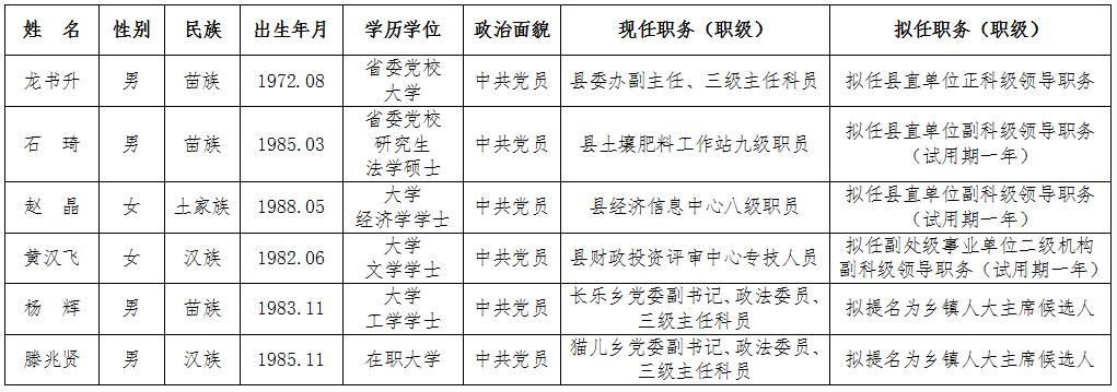 文章来源:中共花垣县委组织部 作者: 时间:2023-08-06 19:30:31为加强对干部选拔任用工作的监督,提高识别和任用干部的准确度,现对县委常委会议研究决定的6名拟任职人选予以任前公示。