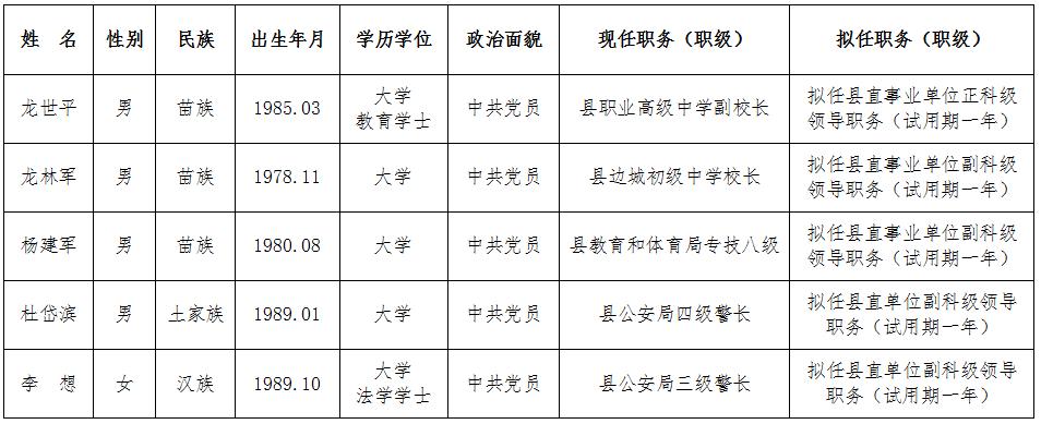 文章来源:中共花垣县委组织部 作者: 时间:2023-08-31 23:10:28为加强对干部选拔任用工作的监督,提高识别和任用干部的准确度,现对县委常委会议研究决定的5名拟任职人选予以任前公示。