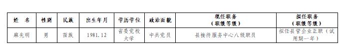 文章来源:花垣县委组织部 作者: 时间:2023-09-17 18:10:39为加强对干部选拔任用工作的监督,提高识别和任用干部的准确度,现对县委常委会议研究决定的1名拟任职人选予以任前公示。