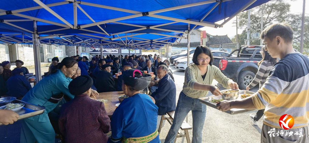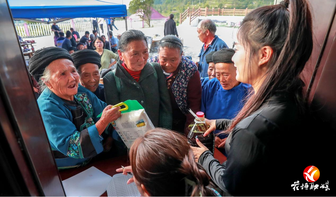 在沙科村部一旁的凤泉边,党员干部为老人们准备敬老宴,摆放桌椅、端菜上桌、发碗放筷,在浓浓的尊老氛围中,老人们其乐融融吃上了敬老宴。同时,县委组织部联合县农商行为老人发放村集体产业生产的大米和菜籽油,让大家共享产业发展成果。