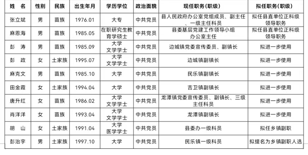 文章来源:中共花垣县委组织部 作者: 时间:2023-11-21 22:30:15为加强对干部选拔任用工作的监督,提高识别和任用干部的准确度,现对县委常委会议研究决定的10名拟任职人选予以任前公示。