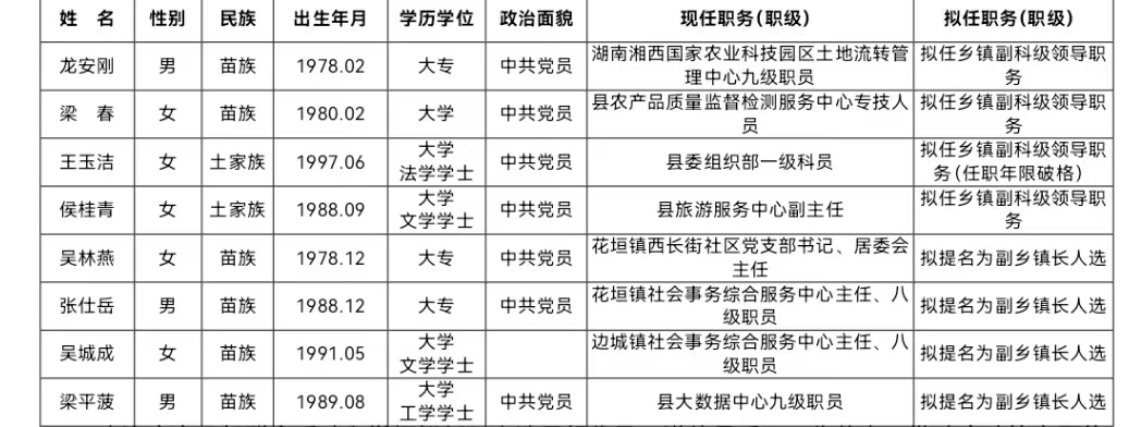 文章来源:中共花垣县委组织部 作者: 时间:2023-11-30 18:30:05为加强对干部选拔任用工作的监督,提高识别和任用干部的准确度,现对县委常委会议研究决定的8名拟任职人选予以任前公示。