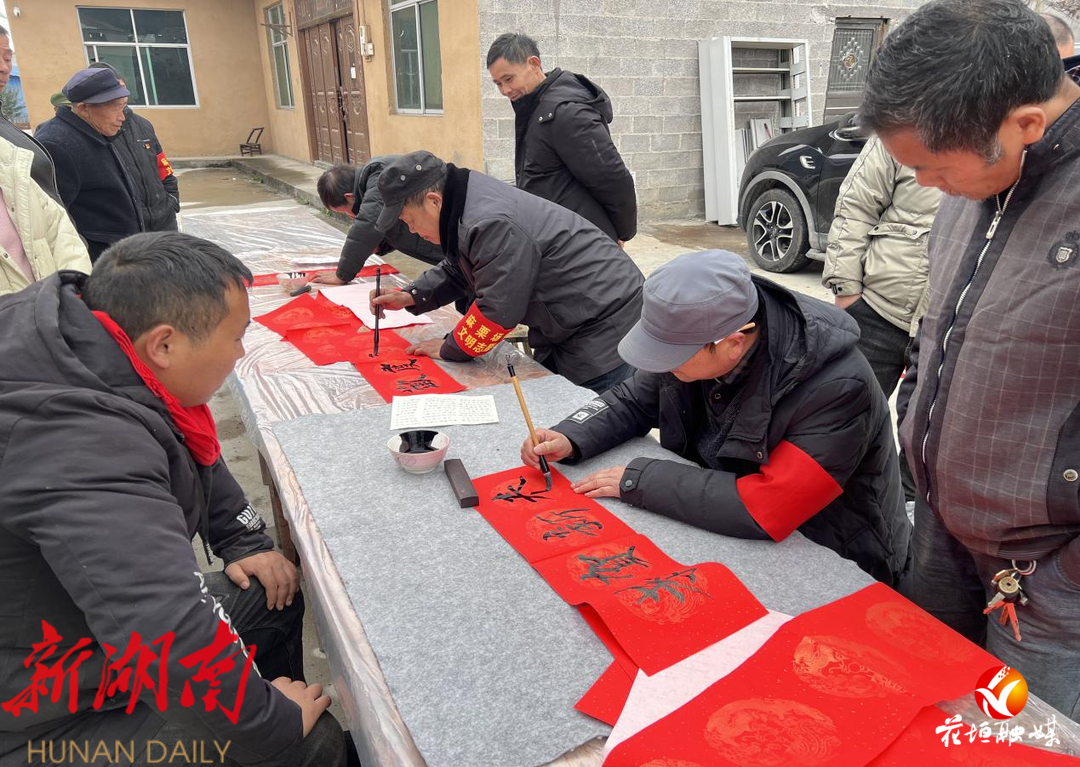 同时,拔河、象棋等活动也在有条不紊地进行。村民们围作一团热热闹闹打糍粑,小朋友们则沉浸于猜灯谜,站在挂满灯笼的树前绞尽脑汁。现场还书写春联免费送给村民们,大家纷纷挑选了自己心仪的春联。最后,村民们围坐在一起吃团圆饭,叙旧迎新、交流感情,其乐融融。