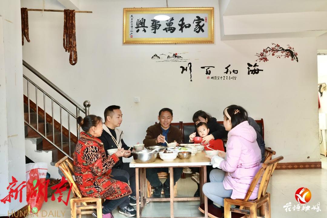 吴清泉一家人在搬迁房里吃着晚饭,其乐融融