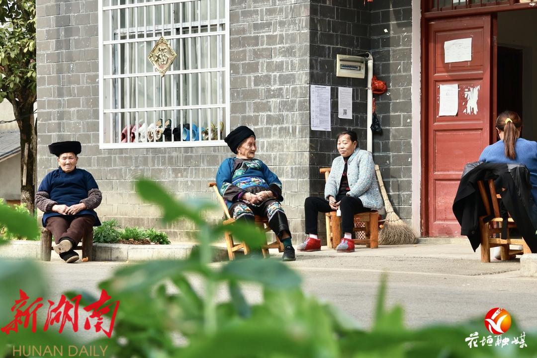 民河社区村民们悠闲地在院子里晒太阳、聊天