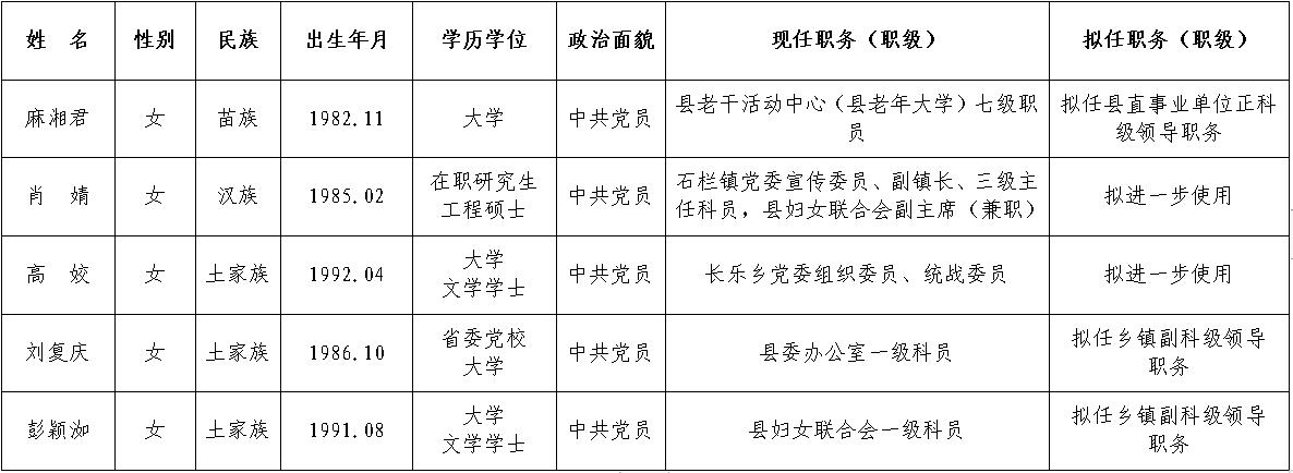 文章来源:中共花垣县委组织部 作者: 时间:2024-02-03 20:46:42为加强对干部选拔任用工作的监督,提高识别和任用干部的准确度,现对县委常委会议研究决定的5名拟任职人选予以任前公示。
