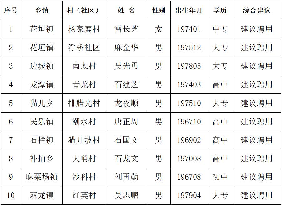按照省委组织部从村(社区)党组织书记中考核招聘乡镇事业编制人员工作指示,通过考核,经县委常委会研究,拟聘用雷长芝等10人为乡镇事业编制人员,现予以公示。公示期5个工作日(2024年7月24日-7月30日)。如有异议,请在公示期内以实名书面形式向花垣县委组织部反映(联系电话:0743-7218031)。