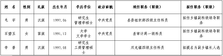 文章来源: 作者:中共花垣县委组织部 时间:2024-10-22 20:58:30为加强对干部选拔任用工作的监督,提高识别和任用干部的准确度,现对县委常委会议研究决定的3名拟任职人选予以任前公示。
