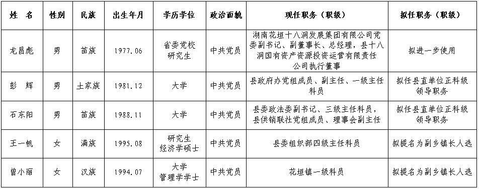 文章来源:中共花垣县委组织部 作者: 时间:2024-12-10 18:34:49为加强对干部选拔任用工作的监督,提高识别和任用干部的准确度,现对县委常委会议研究决定的5名拟任职人选予以任前公示。
